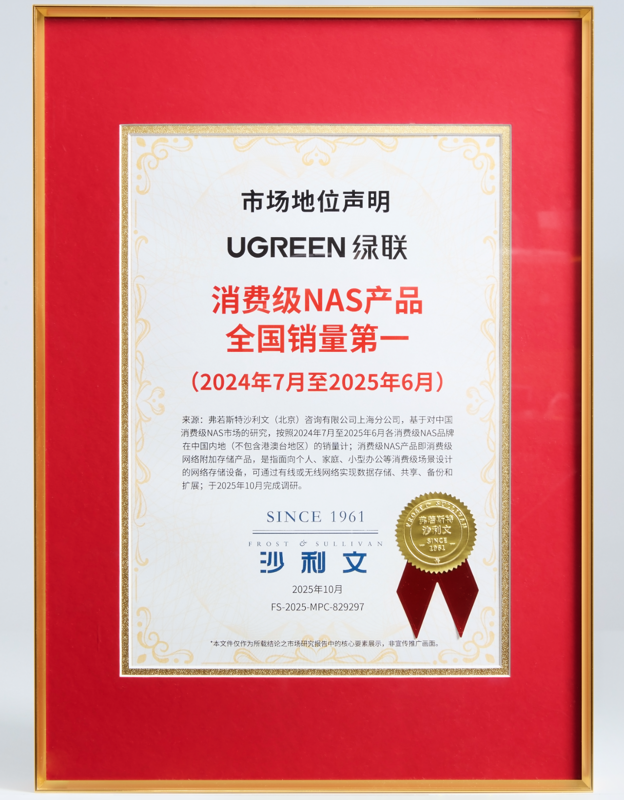 近日,咨询机构弗若斯特沙利文(Frost & Sullivan)基于对中国消费级NAS市场的研究,发布市场地位声明,确认UGREEN绿联(下文简称“绿联”)在2024年下半年至2025年上半年期间,位居中国消费级NAS市场全国销量榜榜首。